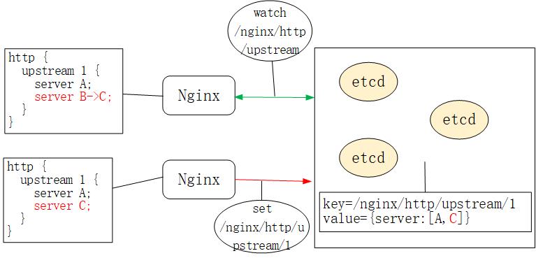 - etcd的watch机制允许客户端监控某个key的变动,即,若类似/nginx/http/upstream这种key的value值发生变动,watch的客户端会立刻收到通知,如下图所示: